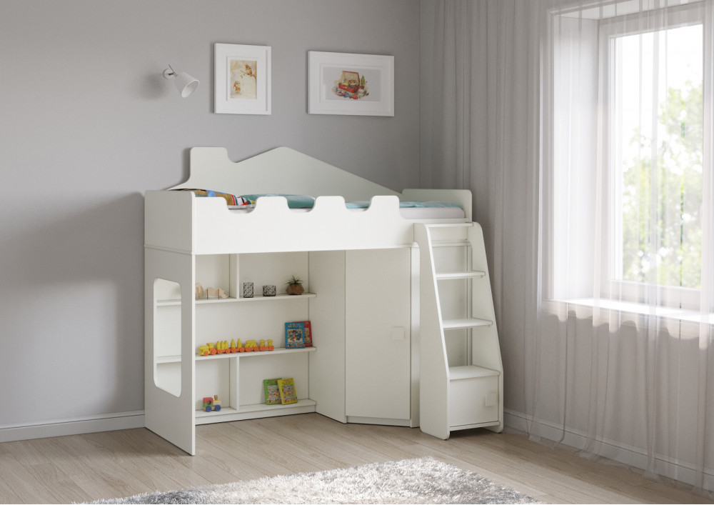 Отличительной особенностью данной модели является наличие прямой лестницы с дверкой, что добавляет элемент игры и позволяет ребенку легко и безопасно подниматься на свое спальное место. Угловой шкаф, расположенный на одном из фасадов кровати, предоставляет достаточно места для хранения одежды, игрушек и других предметов, которые должны быть под рукой.